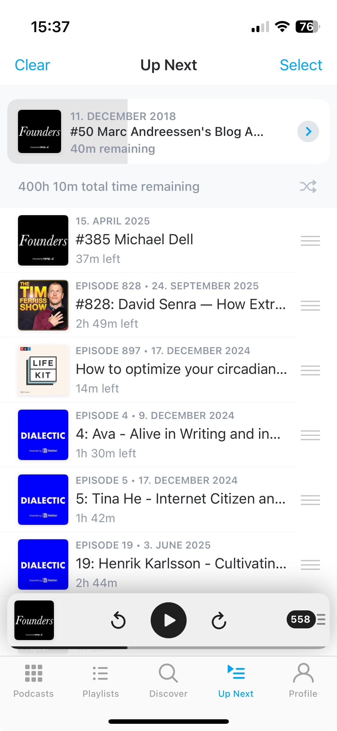 Here’s my podcast queue in Pocket Casts. Notice the 400 hours time remaining and the next episodes in queue having 37m left, 2h49m left, 14m left…