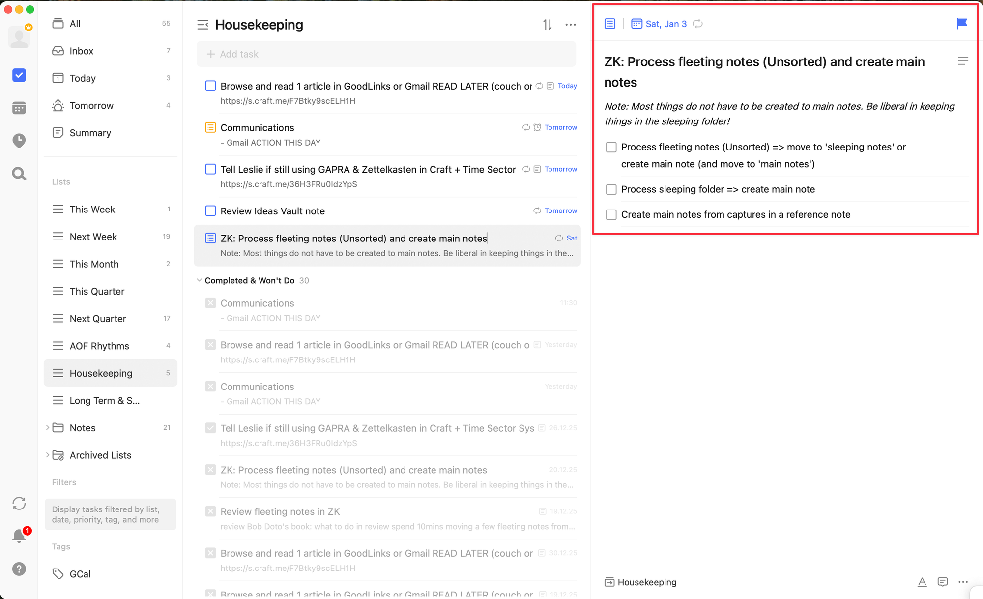 Second, I have a ‘task’ in my task manager (TickTick) that recurs every week to ‘process fleeting notes’.
