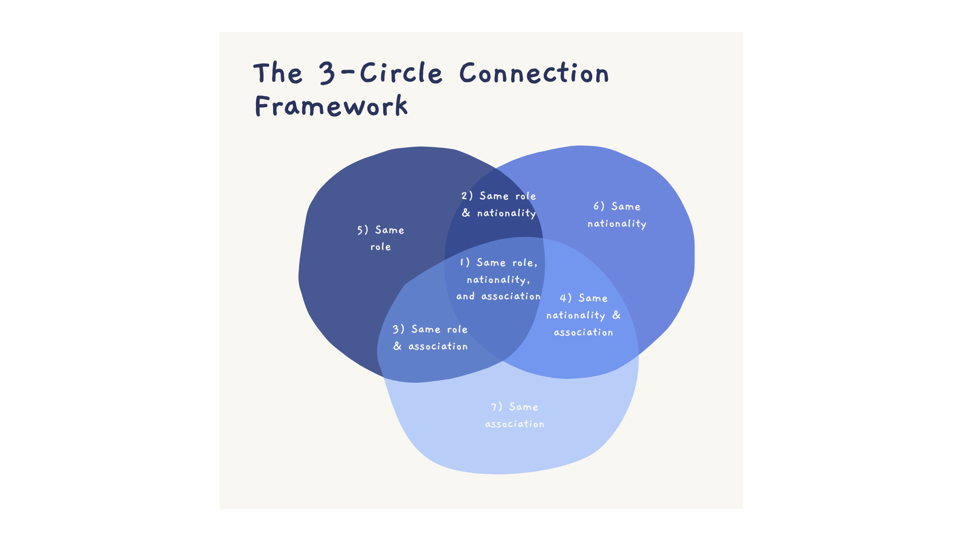 By mixing and matching these circles, you identify 7 types of connections. For example, if you’re a Filipino financial controller with an MBA from Humboldt in Berlin, you can target others who are Filipino, financial controllers, or alumni from Humboldt. Each combination is a potential opportunity.