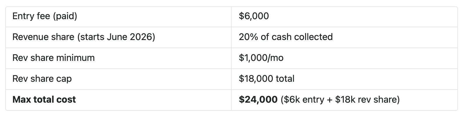 - Risk: $1k/mo rev share minimum kicks in June regardless of revenue pace. This is a floor commitment, not a variable cost.