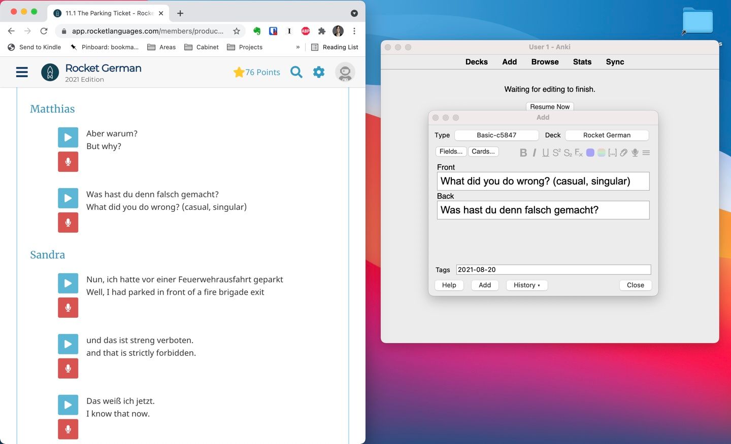 After that, I add the phrases I learned to Anki, a flashcard app, to help put the phrases into my long-term memory.