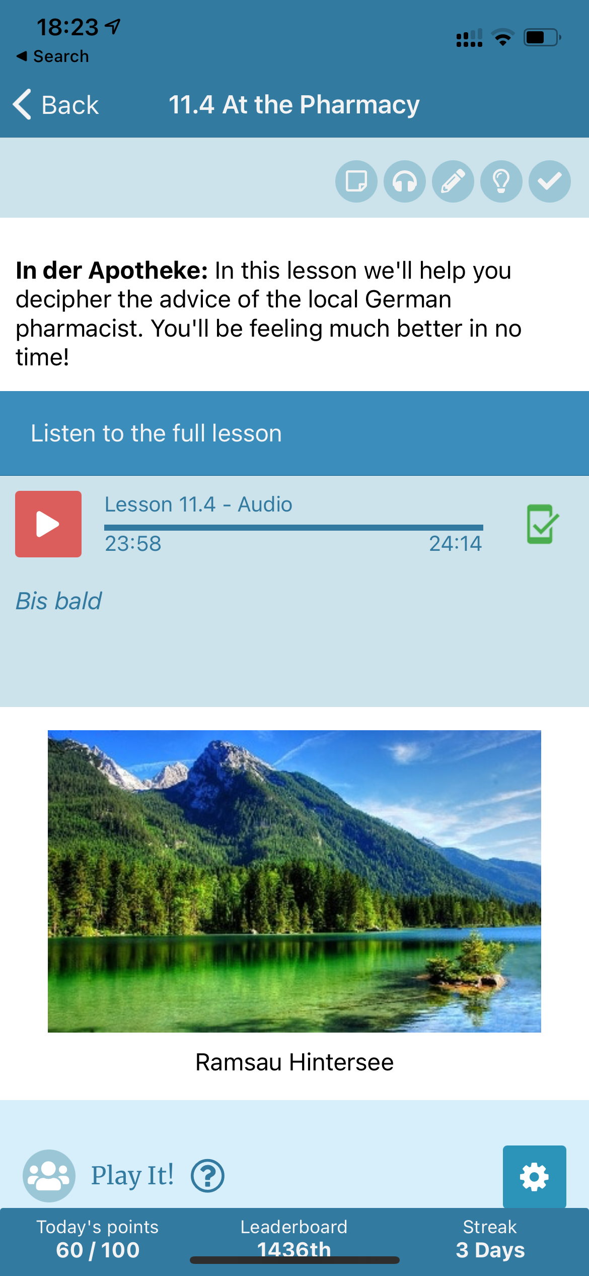 Basically, I take a walk every weekday afternoon and listen to a Rocket German audio lesson. Each lesson is about 30 minutes long. It's a dialogue between two native German speakers concerning a relevant topic. You repeat after them to practice pronunciation and recall.