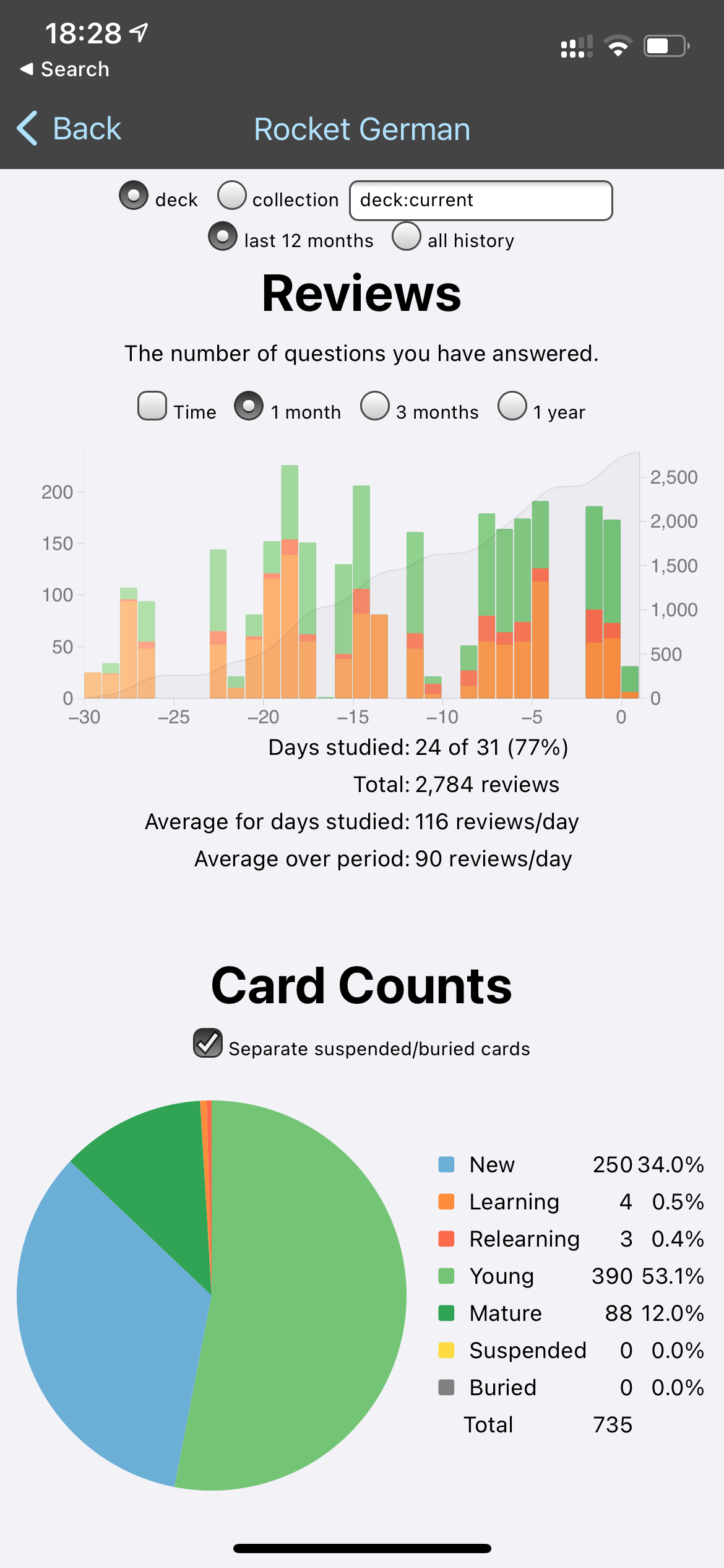 According to Anki, I review 116 card per day, have a total of 735 cards, 88 of which are 'mature'.