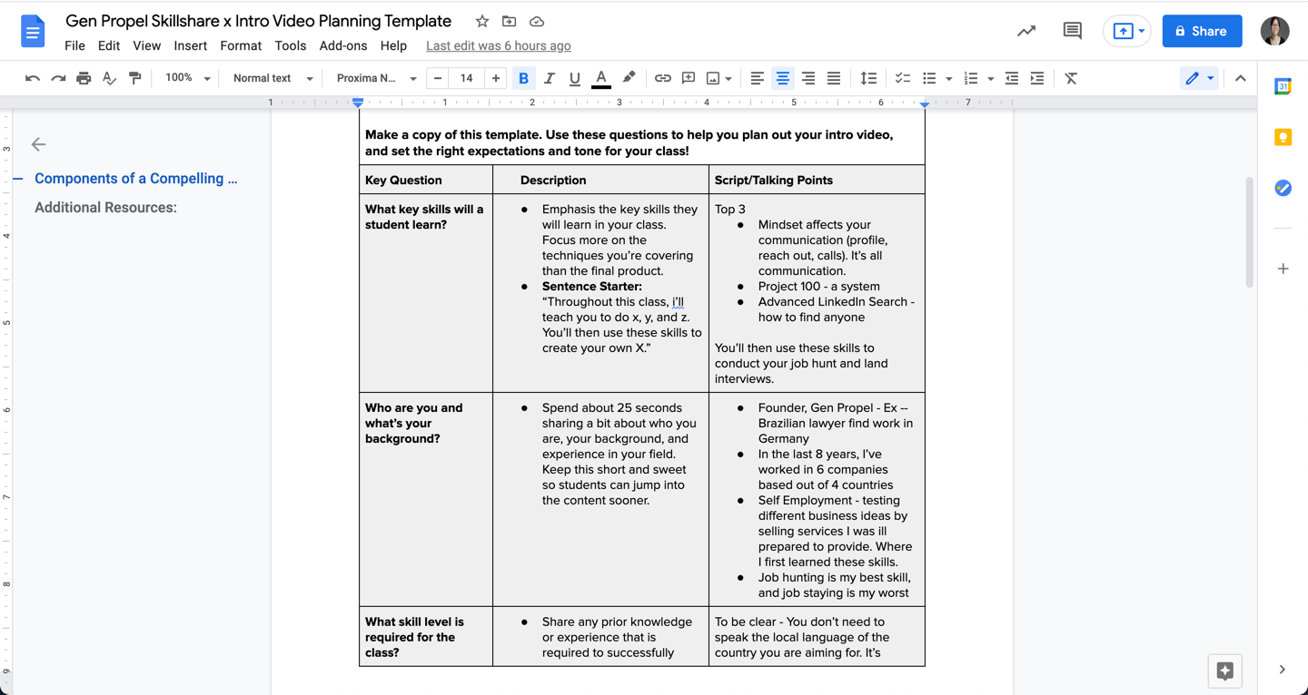 One such resource is the Skillshare x Intro Video Planning Template. Given the prompt, “What key skills will a student learn?" and a small box to write the answer in, I was ‘forced’ to articulate the top 3 skills we help students learn and why they matter.