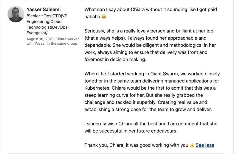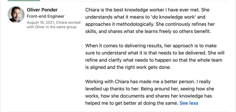 One of the most underrated, most useful habits I've built: When completing some work, leaving a job, etc. ask for testimonials on LinkedIn. I learned this from Sebastian multiple times.