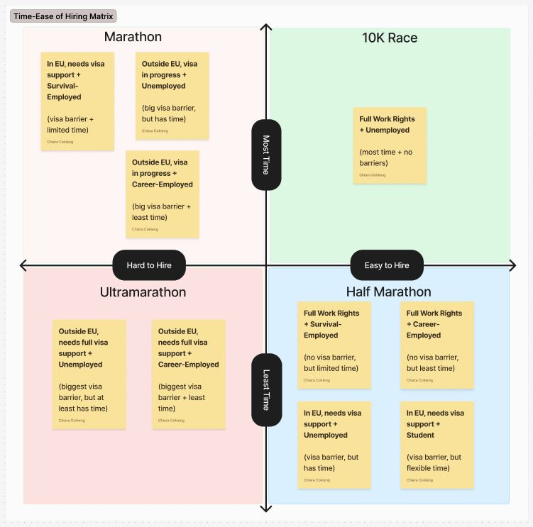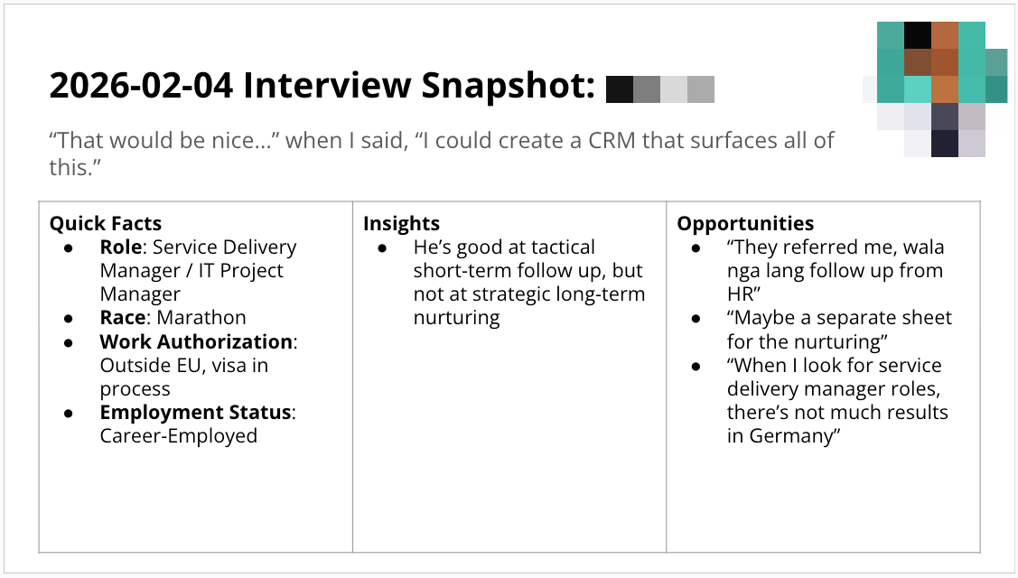 # Customer Interviewsas an actionable metric towards my NSM ofjob-relevant conversations - Did my first customer interview (of a current customer), created my first interview snapshot, and even a "Time-Ease of Hiring Matrix" to determine how easy/difficult it will be to get a job for skilled immigrants in Germany.