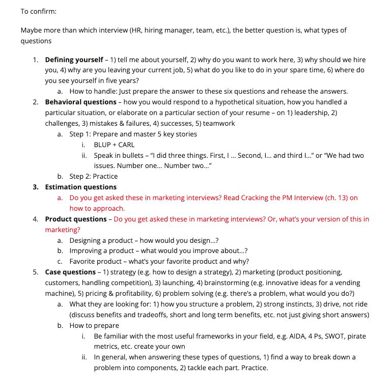 - Discussing the way forward w/ client D (Head of Growth) on helping him w/ interview prep. Figured out that it’s less about WHO he’s interviewing with, but WHAT TYPE of interview questions he struggled w/ the most.