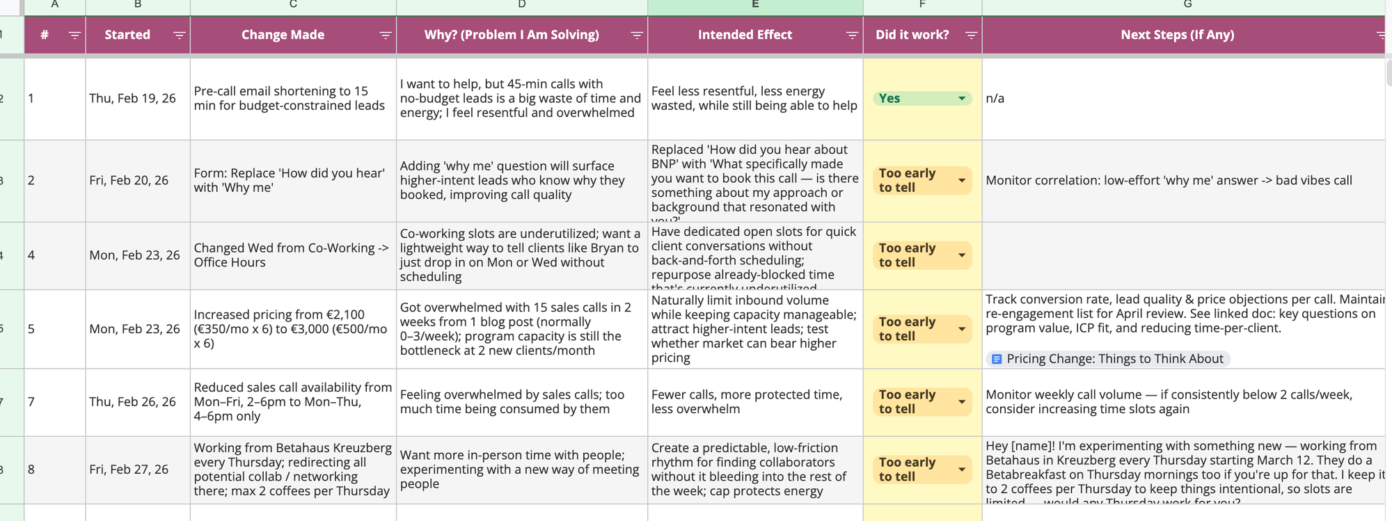 Why? I got (a bit) overwhelmed with 15 sales calls in 2 weeks from a single blog post (normally 0–2/week), and program capacity – 2 new clients/month – has become the new bottleneck. The intended effect: naturally limit inbound volume while keeping capacity manageable, attract higher-intent leads, and test whether the market can bear higher pricing. So far, 4 discovery calls on the new price, seems like it can!