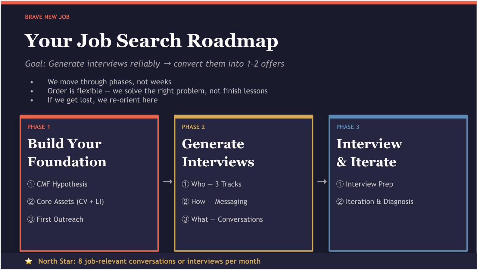 Updated the program roadmap: Replaced the PTR & UVP content with the CMF Hypothesis & Listening Tour, and created a visual to make it more digestible. Already used it with new client R this week and I think it landed well.